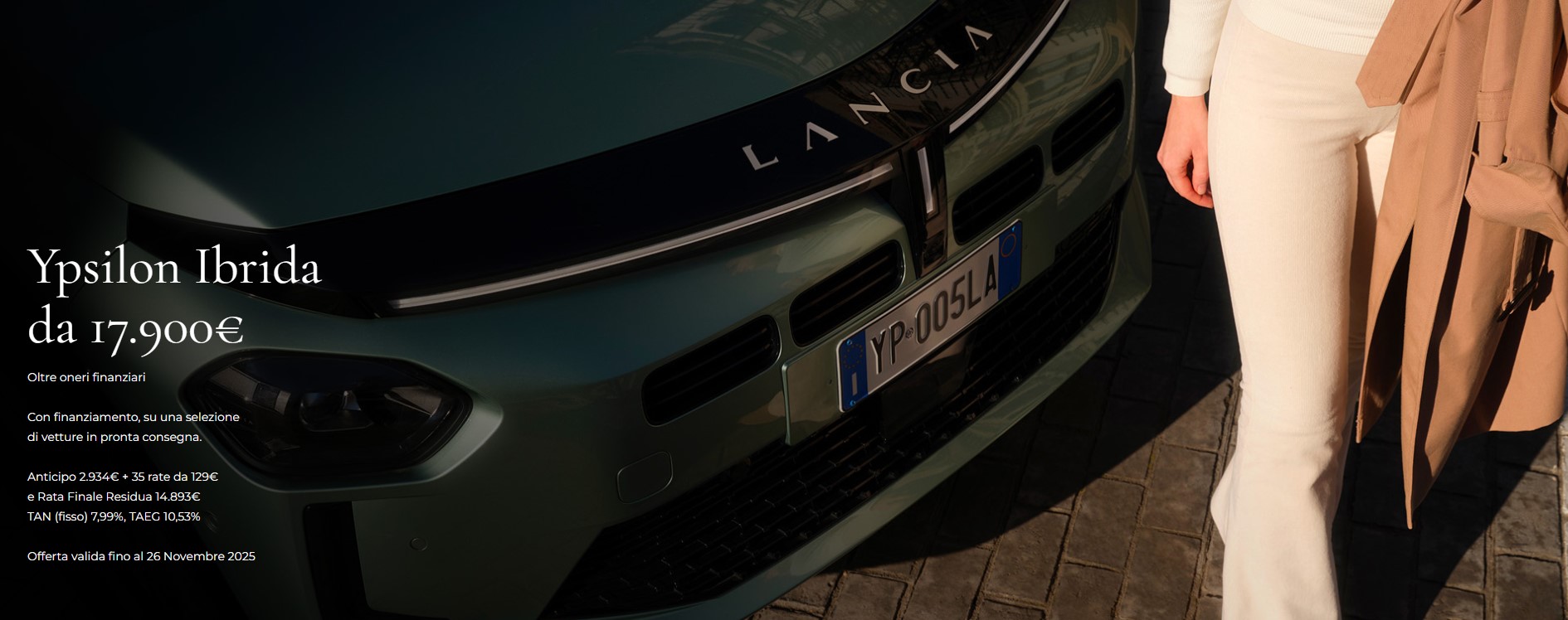 Iniziativa valida fino al 26 Novembre 2025. Ypsilon Ibrida 1.2 100cv Listino €24.900 (IPT e contributo PFU esclusi), promo €19.500 su una selezione di vetture in pronta consegna, oppure €17.900 solo con finanziamento Stellantis Financial Services.